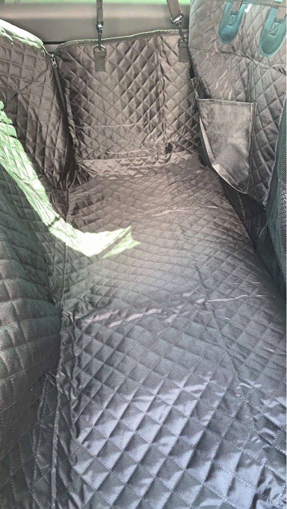 The quality is very good, it has zippers on both sides, so super easy to cover the back seat. Also came with a seatbelt for the pup. The picture is in a jeep grand Cherokee