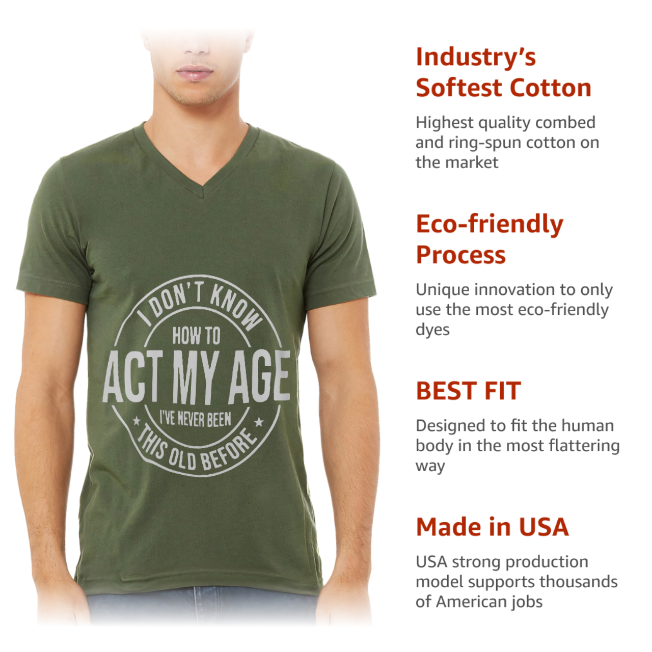 I Don’t Know How to Act My Age V-Neck T-Shirt is proudly made with 7x less water than average manufacturers, in recycle-friendly facilities that also guarantee zero sweatshop conditions.