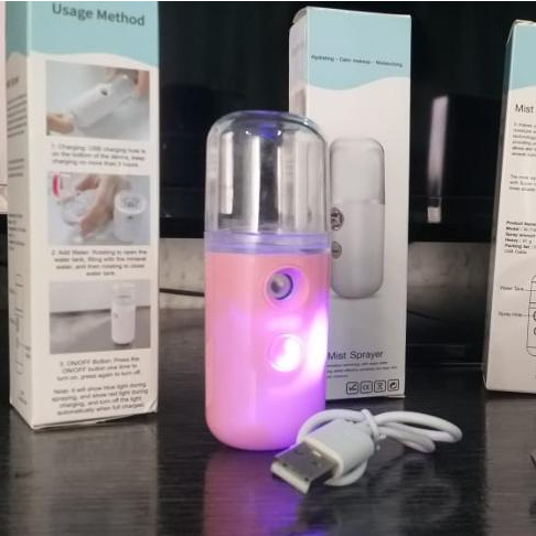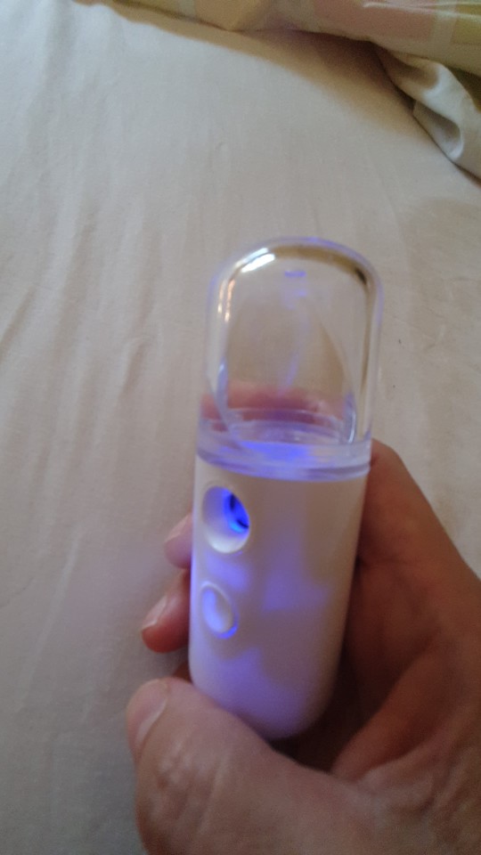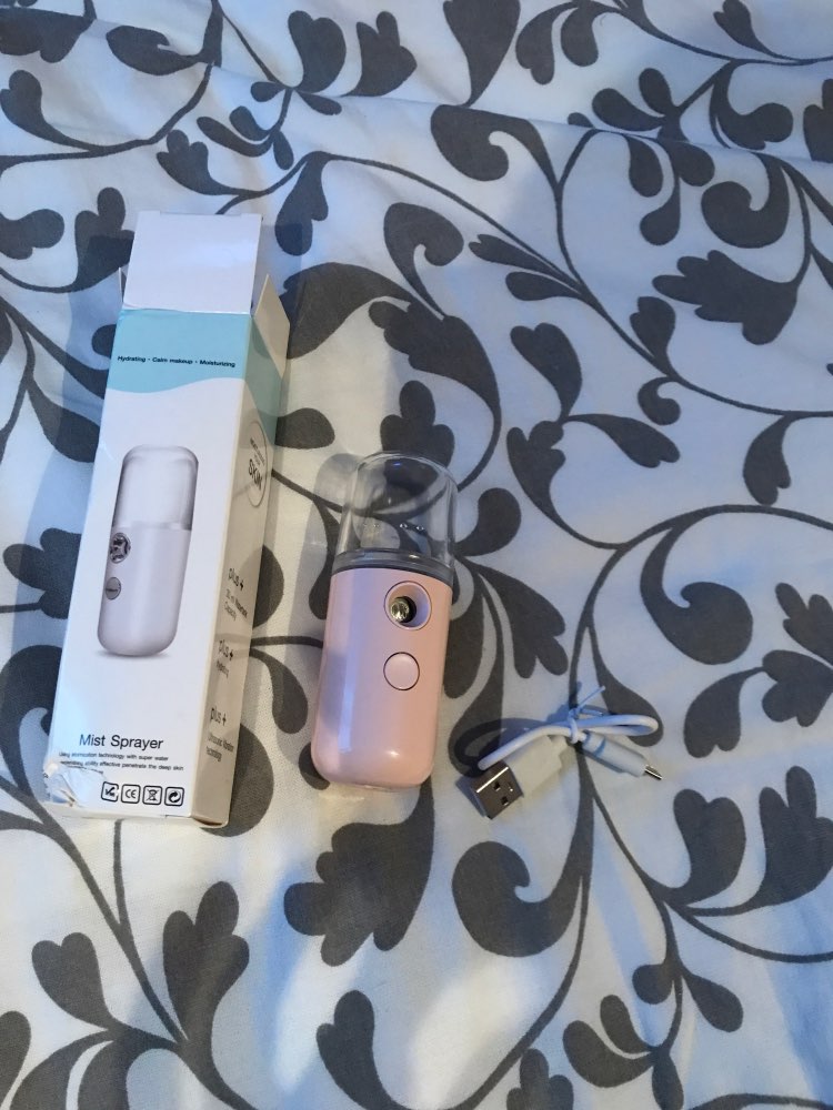 OMG, this works exactly as described. Strong cool mist comes out almost instantly (after connecting, pressing power button, and sliding the cover on front). OK, may be the usb cord is too short. But that's no big deal. Large 30 ml cup capacity. Now I need to come up with ideas what to spray besides water. yes, the skin does feel moisturized with water mist.